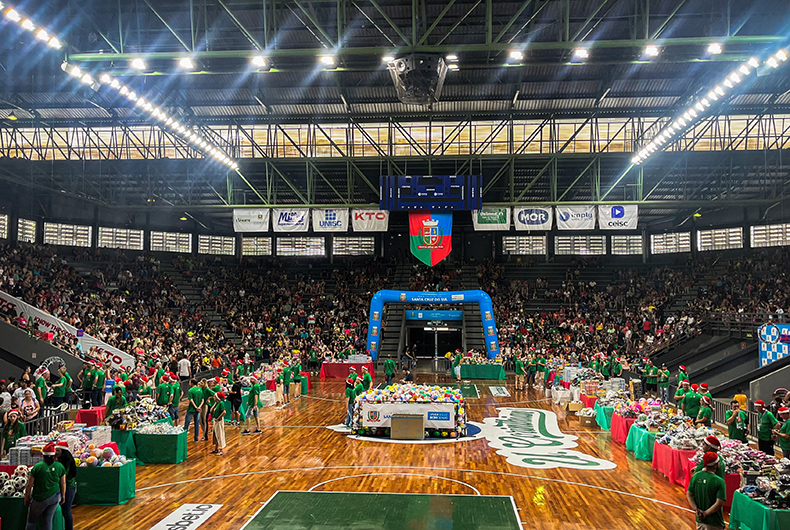 O Ginásio Poliesportivo ficou pequeno para tanta emoção. Milhares de crianças, acompanhadas dos pais ou responsáveis, participaram do Natal Fraterno promovido pela Prefeitura de Santa Cruz do Sul na tarde deste sábado, 3. Além de receberem os tão aguardados brinquedos, no local foram dispostos jogos esportivos e brinquedos infláveis. Houve ainda apresentações artísticas e distribuição de lanches e bebidas.