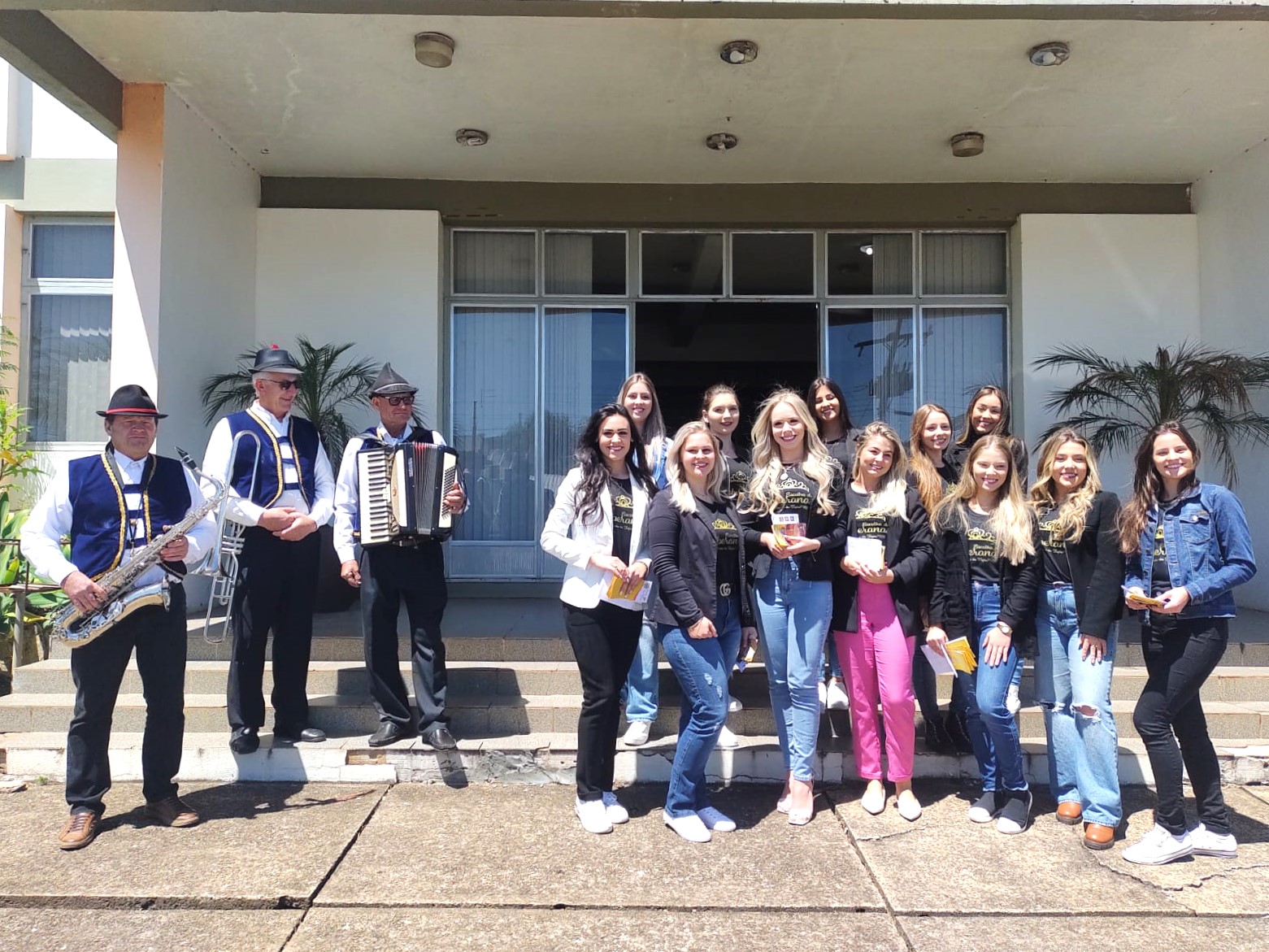 As doze candidatas a rainha e princesas de Arroio do Tigre, juntamente com comitiva da Administração Municipal, estiveram nesta semana visitando o comércio do município e realizando convite para a comunidade prestigiar o baile de escolha das novas soberanas e também o Festival da Cuca, Chopp e Linguiça (dias 18 a 20 de novembro).