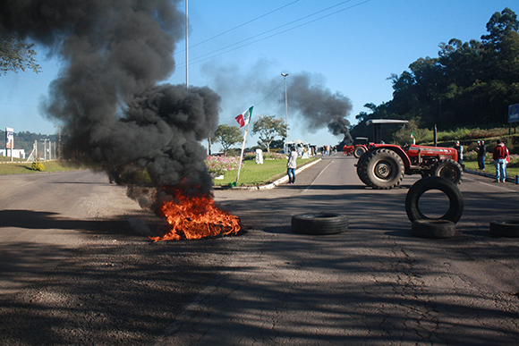 Nesta tarde, estão presentes também na manifestação agricultores do município, representantes das juventudes rurais e comerciantes. Há queima de pneus no protesto.