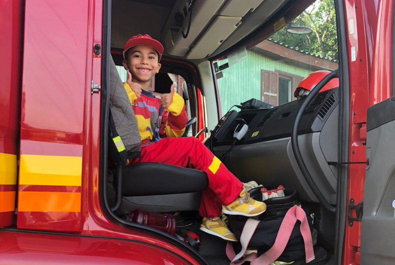 Da sua casa na Rua Antônio Assmann, no Bairro Belvedere, o garoto se encheu de alegria ao ver o caminhão se aproximando. Recebendo a visita do primeiro sargento Flávio Muller e dos soldados Ricardo Todendi e Geniani Nascente, do 6º Batalhão de Bombeiros Militares de Santa Cruz, Arthur se vestiu de bombeiro e subir no caminhão da guarnição.