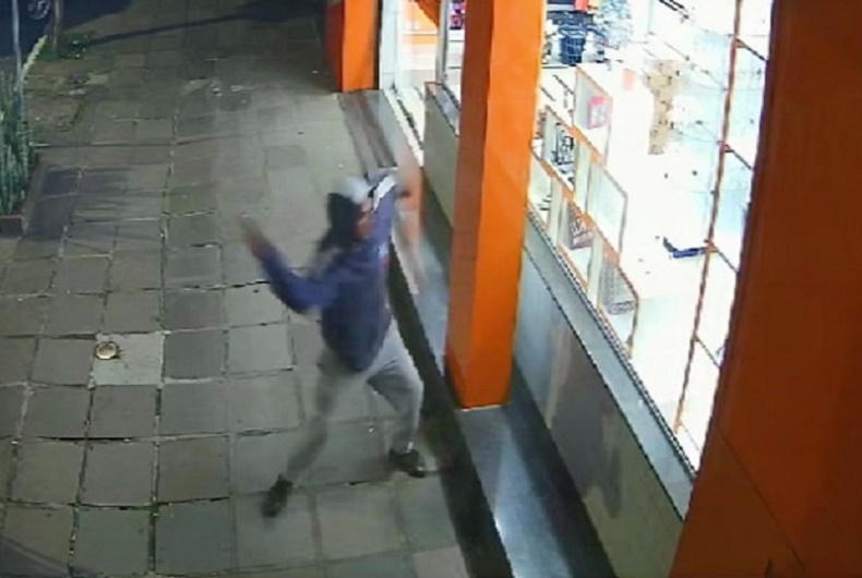 Neste caso, na noite da última segunda-feira, 17, por volta de 23h30, cerca de uma hora antes de ser flagrado pelo vigilante, ele aparece sentado em frente a uma loja da Rua Marechal Deodoro, no Centro. Rapidamente, ele levanta e arremessa uma pedra contra o vidro, mas não consegue quebrá-lo. Aparentemente tendo visualizado uma câmera de segurança apontando para ele, tenta se esconder atrás de um pilar.