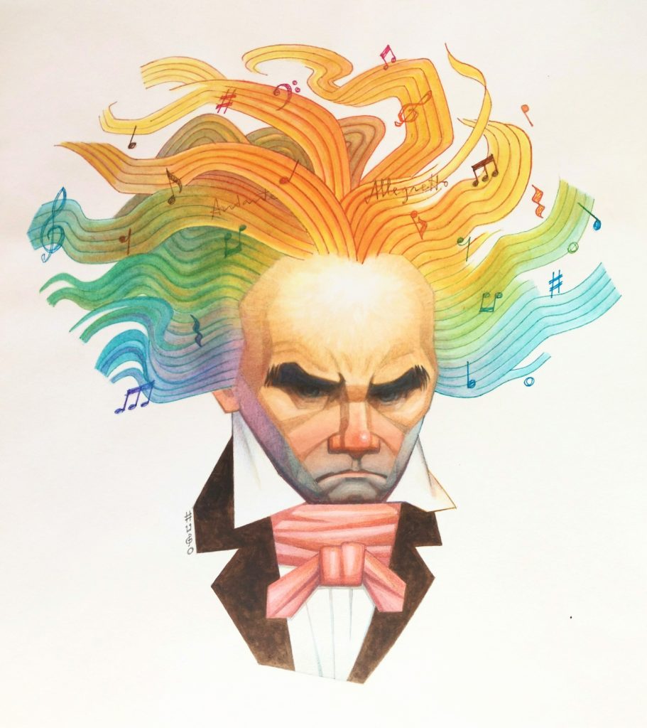 Toda orquestra e todo músico clássico já executaram alguma composição de sua autoria, mas felizmente o gênio irascível da música foi capaz de transcender os limites do erudito em sua popularidade. Sua imagem de cabelos revoltos é um clássico, como na arte do desenhista Hugo Ênio Braz, morador de Santa Cruz do Sul, que você vê abaixo.
