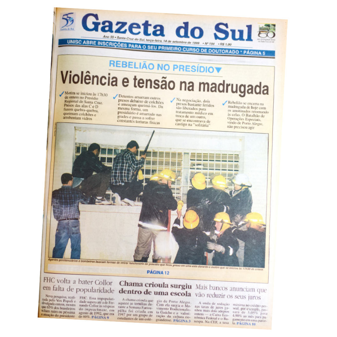 Um presidiário ferido e amarrado nas grades; um agente isolado em um ponto entre alas cheias de presos; três detentos encharcados de álcool junto a colchões sob ameaça de serem queimados; uma retroescavadeira pronta para derrubar a parede; e a tropa de elite da polícia a postos para invadir. Parece cena de filme de ação, mas esse ambiente de tensão máxima aconteceu na realidade, há 25 anos, em Santa Cruz do Sul.