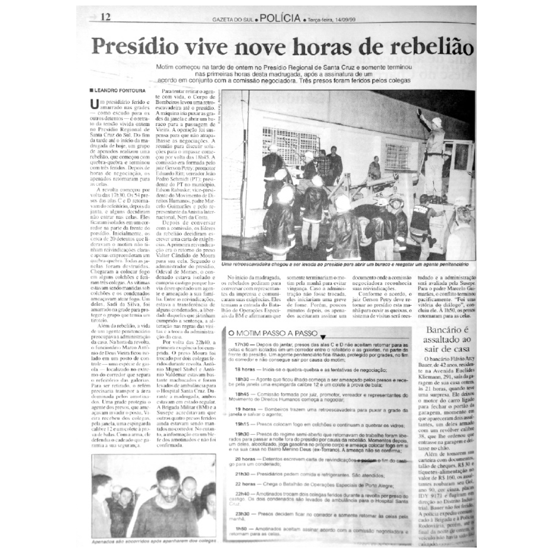 Convidado do podcast Papo de Polícia, produzido pela Gazeta Grupo de Comunicações e lançado na última terça-feira no YouTube do Portal Gaz, o promotor Eduardo Ritt, que atuou no caso, contou bastidores da ocorrência histórica. “Eu era professor de Direito na Ulbra de Cachoeira do Sul e saía pelas 18 horas daqui de Santa Cruz para dar aula lá às 19 horas. Só que naquele dia foi diferente. Houve a rebelião, que foi muito feia”, disse ele.