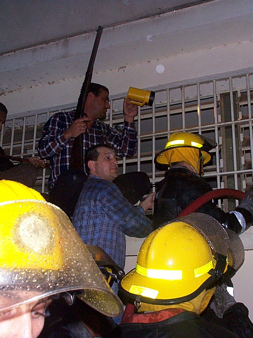 Com isso, ele estava cercado dos dois lados e, para ser resgatado, precisaria passar pela área onde estavam os amotinados, que o ameaçavam com armas brancas. Pela janela, o agente penitenciário recebeu de colegas uma espingarda calibre 12 e um colete à prova de balas. Com a arma ele defendia o cadeado que garantia sua segurança e sobrevivência, por ora.
