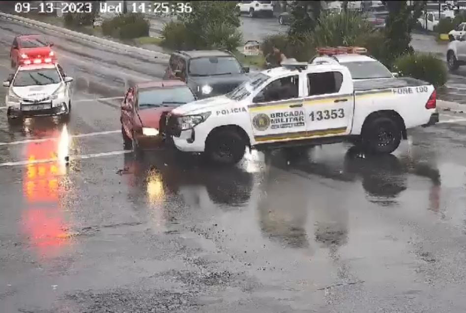 Um caso de tiroteio e perseguição terminou com um policial da Força Tática de Caxias do Sul atropelado na tarde desta quarta-feira, 13. O militar, de 32 anos, foi atingido por um veículo dirigido por um criminoso no Bairro Nossa Senhora de Lourdes. O momento foi flagrado por câmeras de segurança.