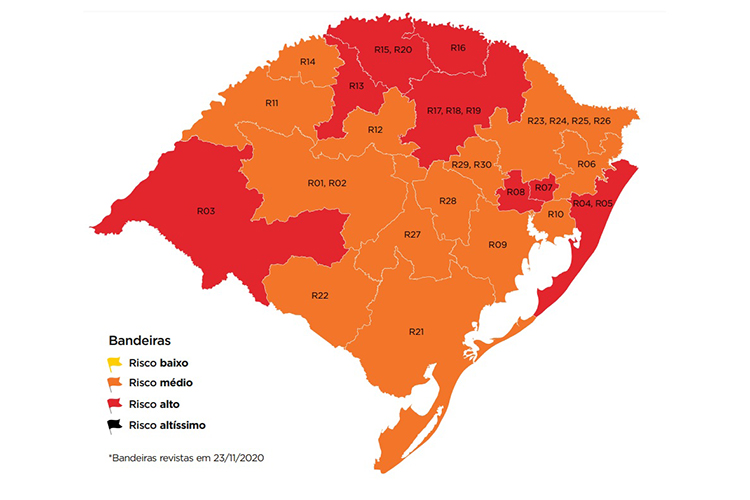As regiões de Novo Hamburgo, Canoas, Ijuí e Capão da Canoa foram classificadas pela segunda semana consecutiva em bandeira vermelha. De acordo com a nova regra, as escolas privadas e públicas deverão interromper as aulas que já estavam ocorrendo ou adiar o retorno, caso ainda não estivessem recebendo alunos de forma presencial.