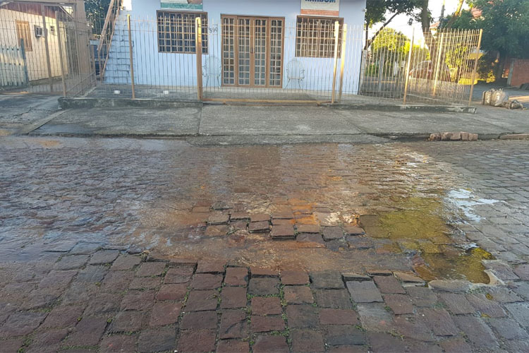 Um vazamento de água cobre parte da Rua Senador Salgado Filho, no Bairro Avenida, na manhã desta sexta-feira, 3, em Santa Cruz do Sul. No local, o calçamento já cedeu em função do problema. Além disso, a água esteve perto de invadir algumas casas.