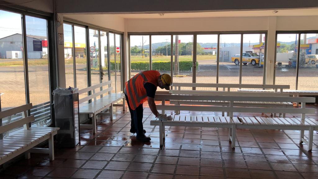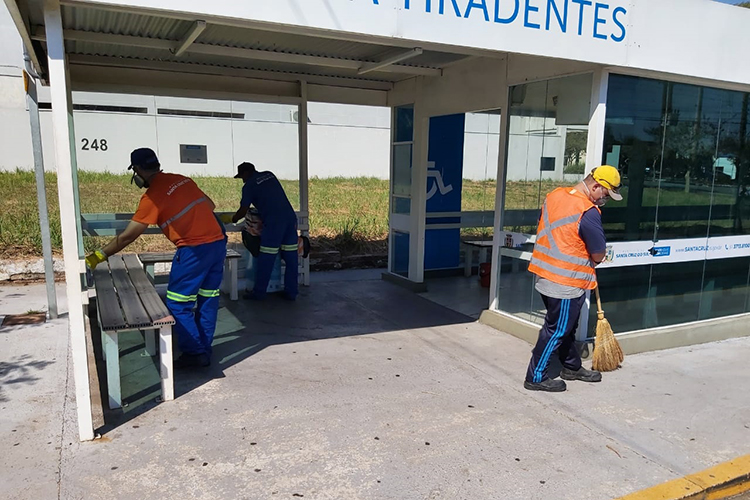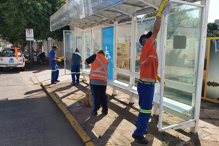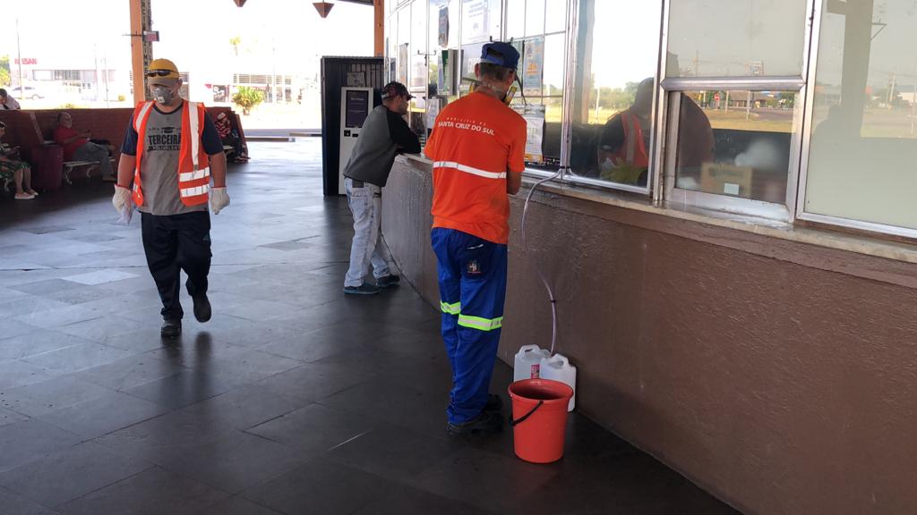 No combate ao coronavírus, a prefeitura de Santa Cruz do Sul intensificou a limpeza de determinados pontos em que circulam muitas pessoas diariamente. Na manhã desta quinta-feira, 26, uma equipe trabalhou na higienização da Estação Rodoviária. Além disso, nas superparadas, diariamente, profissionais passam água sanitária e álcool nos abrigos.