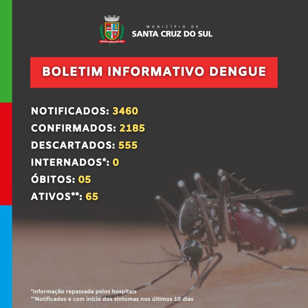 O boletim divulgado nesta quarta-feira, 9, registra um total de 2.185 casos confirmados da doença no município. Deste 65 estão ativos (notificados e com início dos sintomas nos últimos 10 dias). Até o momento, o município registrou cinco óbitos por dengue. O mais recente foi de um homem de 71 anos, morador do Bairro Arroio Grande.