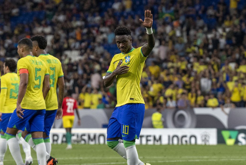 O Brasil sobrou diante da Guiné com goleada de 4 a 1 no estádio Cornellà-El Prat, em Barcelona (Espanha), no último sábado, 17. Joelinton, Rodrygo, Éder Militão e Vinícius Júnior, o protagonista da partida com a camisa 10, marcaram para o escrete canarinho, e Guirassy descontou para a Guiné. A partida foi repleta de manifestações contra o racismo em solidariedade a Vini Jr., alvo reiterado de insultos racistas no Campeonato Espanhol, o último deles em 21 de maio.
