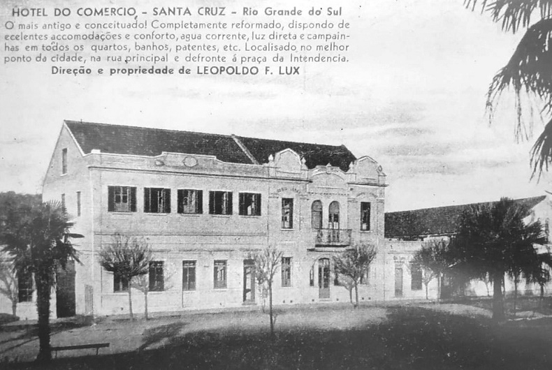 O leitor Hélio Bischoff nos encaminhou belas fotos do Hotel do Commercio, o mais antigo de Santa Cruz do Sul. Ele foi fundado pelo imigrante alemão Carl Kern, em 1874, com o nome de Hotel Kern. Quando sua economia foi vendida para Guilherme Scherer, passou a chamar-se de Hotel Scherer. Importantes reuniões políticas ocorreram em seu refeitório.