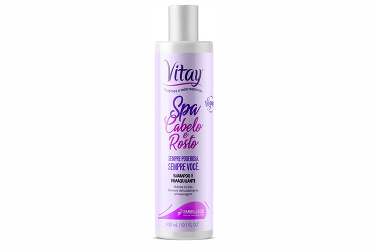 O Shampoo e Demaquilante Vitay Cabelo e Rosto atua tanto nos fios quanto no rosto e conta com tecnologia micelar em sua fórmula, conhecida pelo seu poder limpeza profunda sem ressecar a pele. Nos cabelos, o Shampoo auxilia na purificação dos fios, ao mesmo tempo em que hidrata. Já no rosto, o produto remove delicadamente a maquiagem, impurezas e poluição.