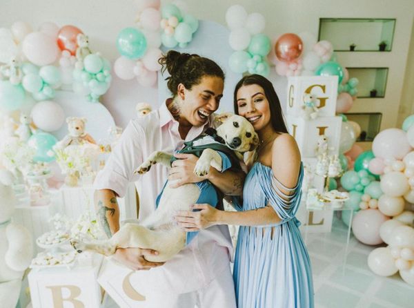 O animal foi o ‘arauto’ da revelação, uma vez que a brincadeira para o casal saber o sexo do bebê envolveu a entrada do bichinho vestido com uma roupa na cor azul.