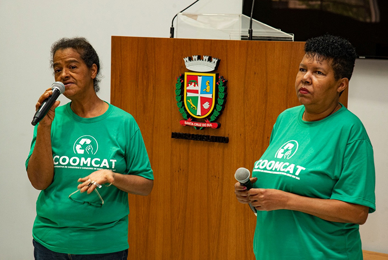 Um dos painéis do workshop foi apresentado pelas representantes da Coomcat, Vera Lúcia Flores e ngela Nunes. Elas explicaram qual a melhor forma de a população contribuir para a coleta seletiva, que é separando os resíduos em, pelo menos, dois locais diferentes dentro de casa e também na rua. “Uma lixeira para os recicláveis, que são as latinhas, os plásticos, os papelões, e outra para os rejeitos, onde se encaixa o lixo orgânico e outros materiais que não podem ser reaproveitados, como é o caso do papel higiênico e de fraldas descartáveis”, explicou Vera, presidente da Cooperativa. Na rua, o descarte deve ser feito no contêiner verde para os rejeitos e no laranja para os recicláveis. “Se não tiver contêiner laranja próximo de sua casa, leve até a Coomcat ou então deixe do lado de fora do contêiner verde, que a Coleta Seletiva irá recolher”, detalhou. Os locais, dias e horários de passagem da coleta seletiva em cada localidade estão disponíveis no site da Prefeitura e na página do Instagram da Secretaria de Meio Ambiente de Santa Cruz do Sul.