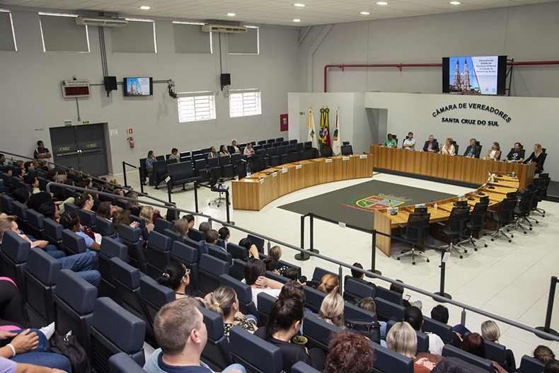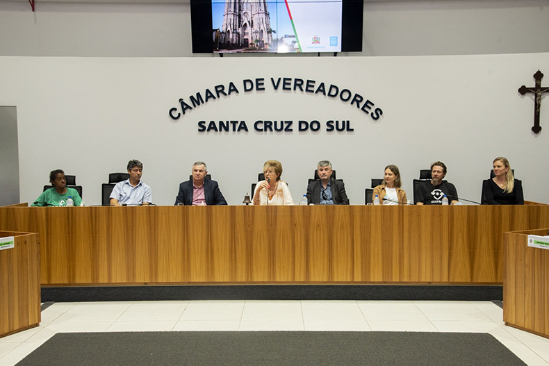 Reduzir a quantidade de lixo descartado – muitas vezes de forma inapropriada – é um dos atuais desafios do poder público de Santa Cruz do Sul. A fim de buscar soluções ao problema, foi realizado nesta terça-feira, 24, na Câmara de Vereadores, um evento reunindo autoridades municipais e especialistas no assunto, que levaram informações sobre formas corretas de destinação de resíduos para um auditório composto por lideranças de bairros, agentes comunitários de saúde, diretores e supervisores de escolas e público engajado na causa. Organizado pela Prefeitura, em parceria com o Instituto Lixo Zero Brasil, Cooperativa de Catadores e Recicladores de Santa Cruz do Sul (Coomcat) e empresa meuResíduo, o evento integrou a programação da 5ª Semana do Lixo Zero, que segue até a próxima sexta-feira, 27.