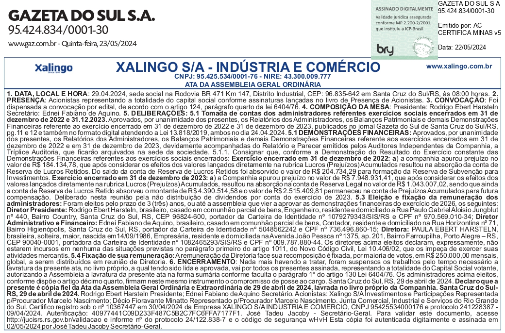 Xalingo S/A Indústria e Comércio – Ata da Assembleia – Publicidade Legal – Edição 23/05/2024