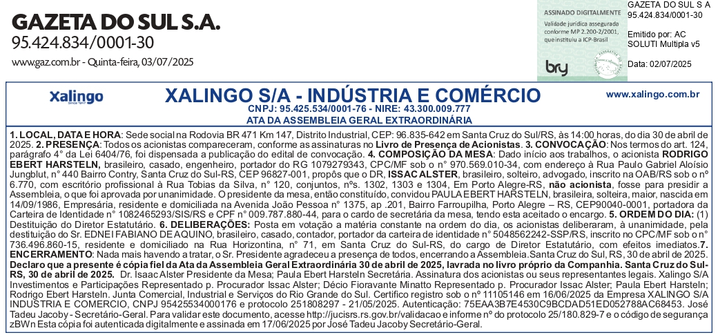 Xalingo S/A Indústria e Comércio – Ata – Publicidade Legal – Edição 03/07/2025