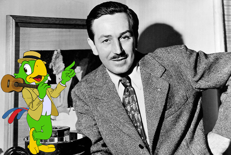 Em 1941, Walt Disney passou alguns dias no Rio de Janeiro, hospedando-se no Copacabana Palace. Por esses dias, conviveu com o cartunista José Carlos de Brito e Cunha (1884-1950), popularmente chamado J. Carlos, que então desenhava versões nacionais dos personagens de Disney. Há quem diga que Walt teria feito o primeiro esboço de um José Carioca, um papagaio estilizado, homenageando no nome o amigo artista. Talvez tenha tido mais de uma inspiração, mas a verdade é que uma das aves mais populares dos trópicos só poderia mesmo se prestar para representar o Brasil naqueles anos do século 20. Com o lançamento mundial de Alô, Amigos, produzido em 1942 e levado às telas no ano seguinte, era José Carioca (isto é, Zé Carioca) quem apresenta Pato Donald… à cachaça e ao samba!